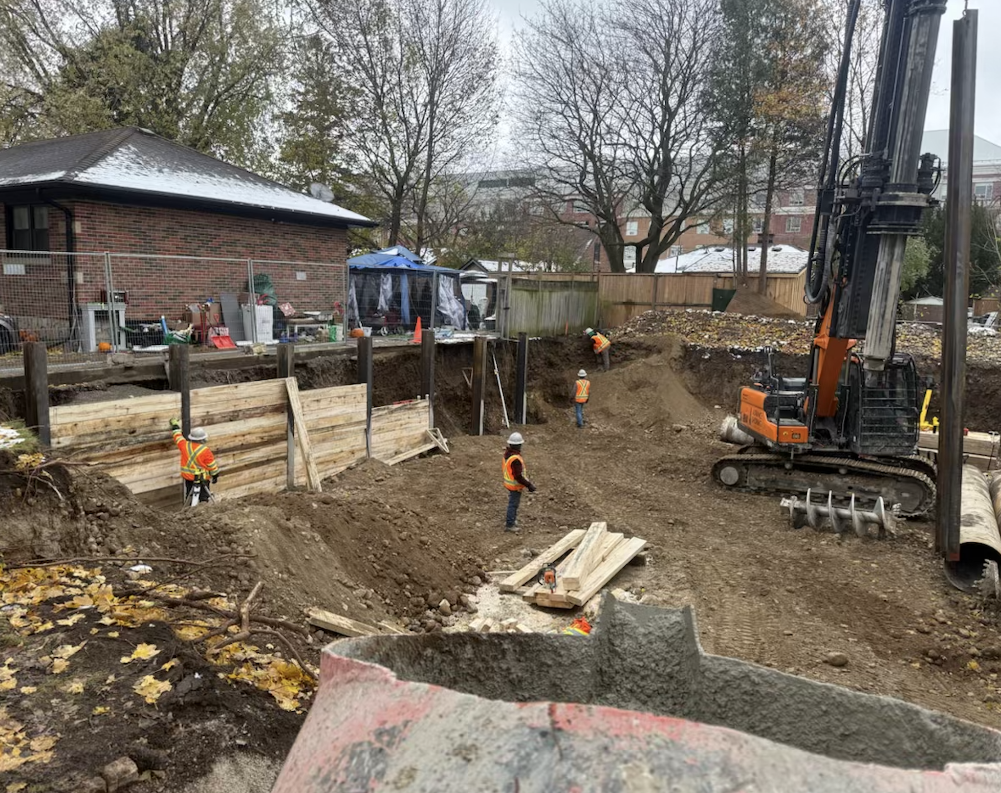 Installation of a soldier pile and lagging system in a confined residential site, ensuring safe excavation.